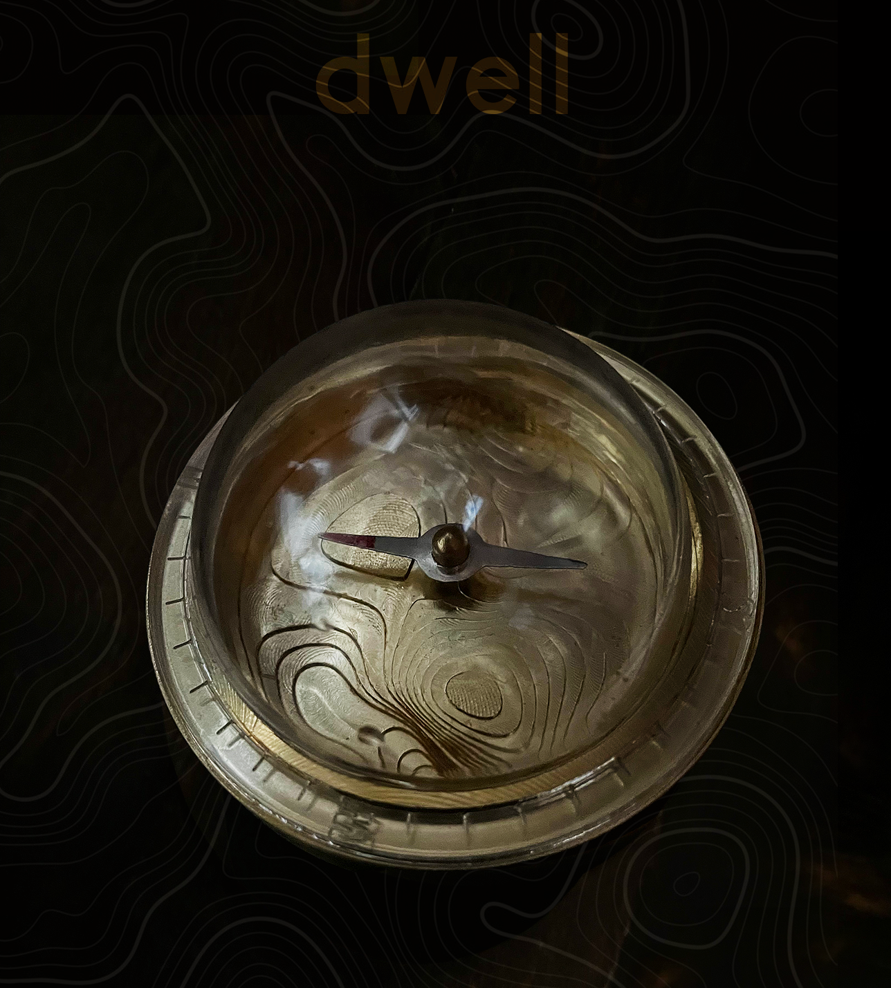Machined compass generated from the coordinates of all the places I've called home. Dwell as in the state the CNC is in at rest, a dwelling place, or a moment of lingering. It serves as homing grounds, both a wayfinder for explorations and an anchor for journeys taken - matched to the traces left by the CNC.