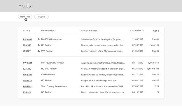 The first problem we chose to tackle as we built the MVP was the lengthy, untracked holds process. With so many systems and constantly changing policy regarding holds, refugee cases could get so delayed they required a re-interview, creating further work for officers.